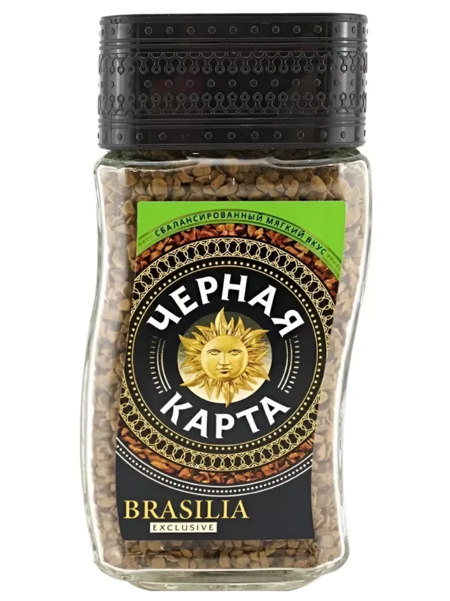 Черная Карта, Кофе растворимый Exclusive Brasillia, 95 гр. Вкуснейший растворимый кофе "Черная карта" - 100% арабика. Это богатый ассортимент редких сортов кофе из разных стран мира. Сублимированный кофе ручной обжарки отличается продолжительным терпким послевкусием и ярко выраженным сладковатым ароматом. Чашечка капучино утром или кружка латте, лучший выбор, для создания хорошего настроения. Мягкий, гармонично сбалансированный кофе не содержит добавок. Его легко приготовить, просто добавьте воду, и ароматный напиток готов. Чтобы вы могли насладиться всеми оттенками насыщенного напитка, мы сделали надежную упаковку, которая надолго сохраняет вкусовые качества. Каждый глоток "Черная карта" подарит вам истинное удовольствие!