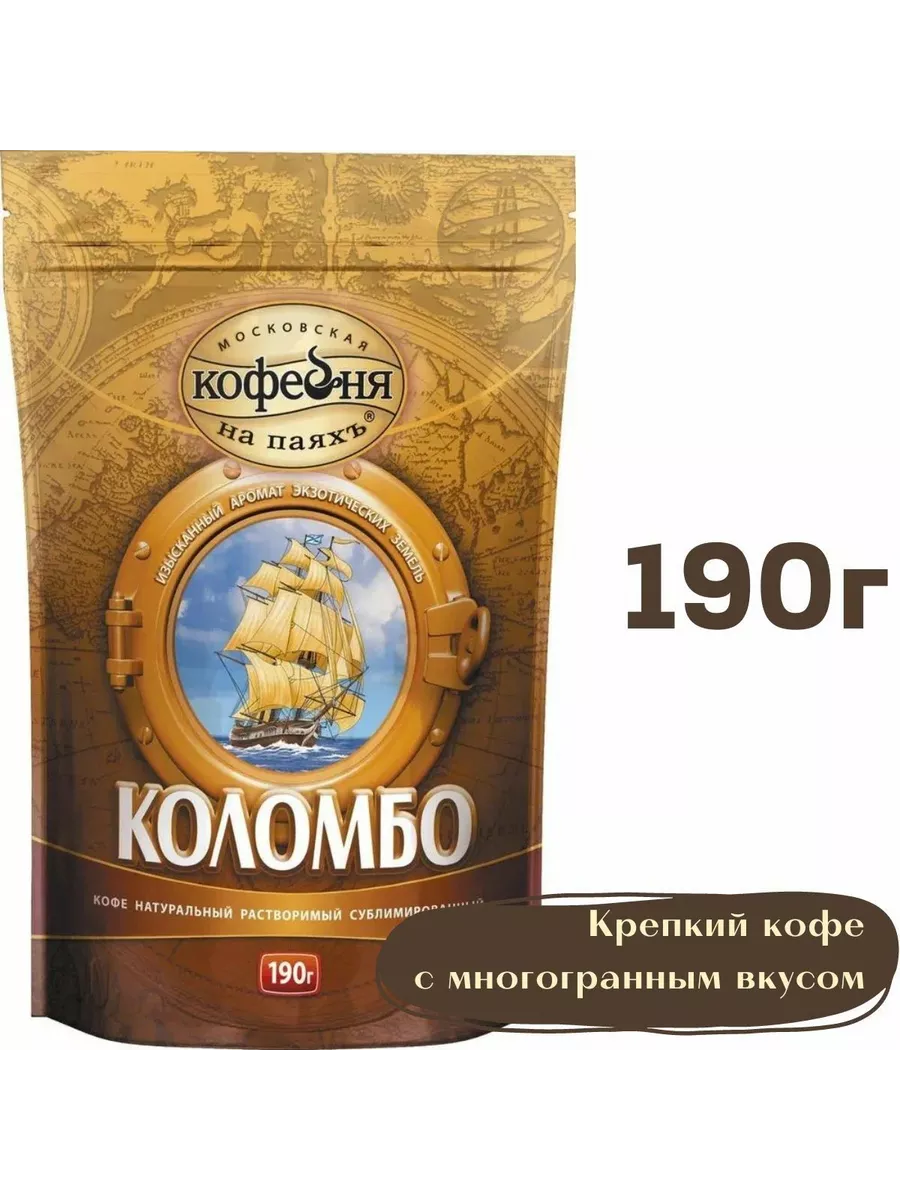 Кофе, Московская кофейня на паяхъ, Коломбо, растворимый, 190г. пакет Кофе растворимый сублимированный Московская кофейня на паяхъ Коломбо 190 г - это крепкий, слегка терпкий кофе с характером, который подарит вам отличный заряд бодрости и удивит богатством вкуса. Для его создания использовались отборные кофейные зерна из Южной и Центральной Америки, которые были подвержены венской обжарке профессионалами своего дела. Подобная темная обжарка позволяет максимально раскрыть аромат зерен и сделать напиток крепким, с ярко выраженными кофейными нотами и тонизирующим эффектом. Московская кофейня на паяхъ создает качественный кофе благодаря неизменным составляющим: квалифицированные специалисты с большим опытом работы, современное высокотехнологичное оборудование и любовь к своему делу. На сегодняшний день компания - один из лидеров на российском рынке. Растворимый кофе Коломбо одинаково подходит как для дома, так и для офисного применения. Его бодрящие качества станут отличным способом поддерживать энергию в течение дня и вдохновляться на новые свершения. Чтобы приготовить чашку ароматного напитка, достаточно взять 1-2 чайные ложки кофе и залить горячей, но не кипящей водой. Мягкая вакуумная упаковка надежно защищает гранулы от нежелательного контакта с влагой и воздухом, сохраняя свежесть и аромат напитка.