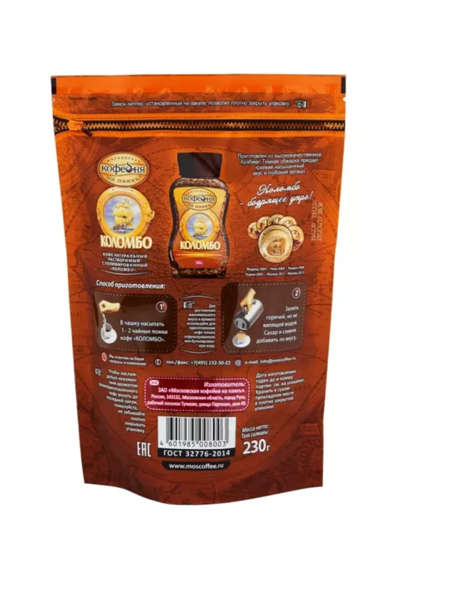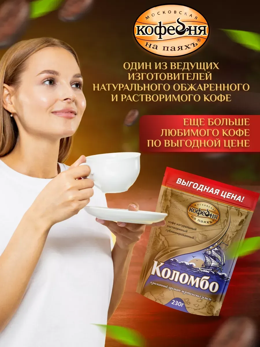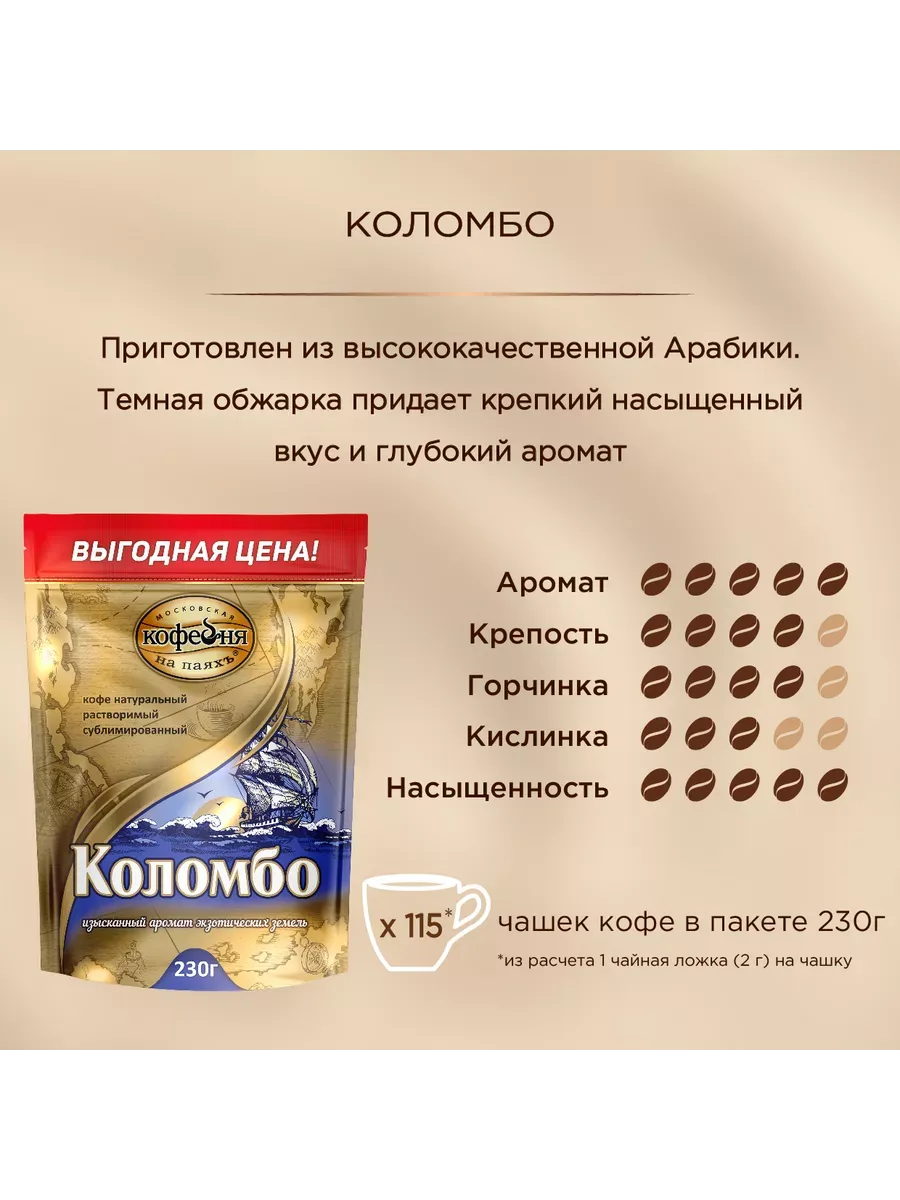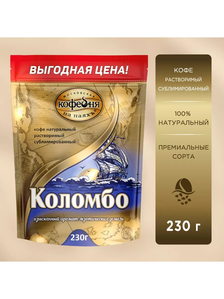 Кофе растворимый Коломбо от Московской Кофейни на Паяхъ – это идеальный выбор для тех, кто ценит настоящий вкус кофе без необходимости заваривания. Наполненный 230 граммами ароматного кофе, этот продукт предлагает удобство и качество одновременно. Смесь создана из высококачественных зерен, что обеспечивает насыщенный вкус и аромат. Коломбо от Московской Кофейни на Паяхъ – это не просто кофе, это ваш личный энергетический заряд на каждый день.
