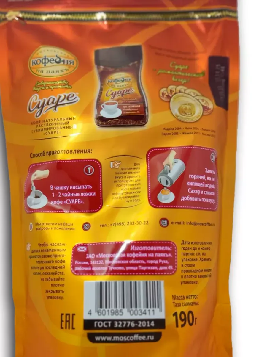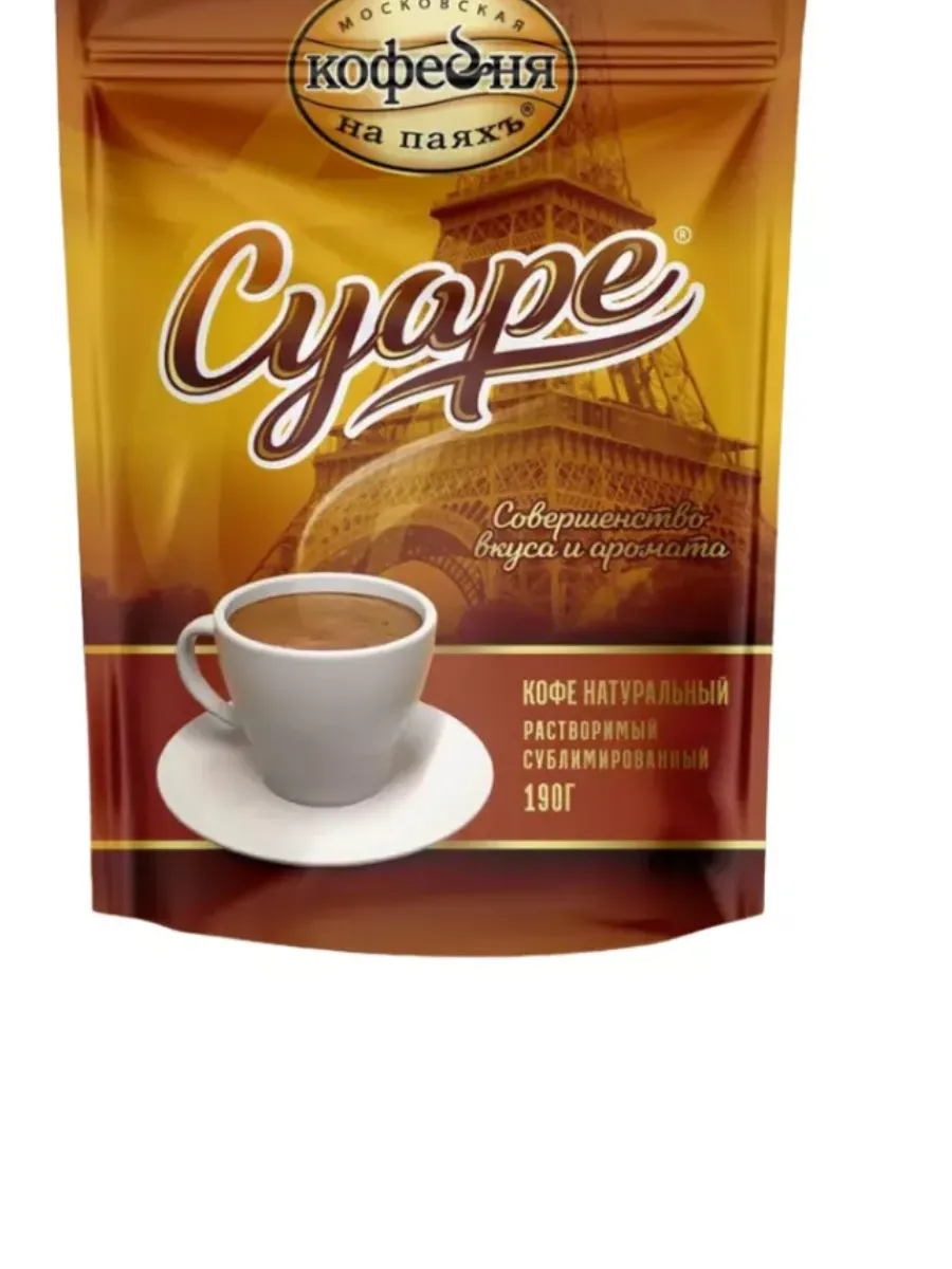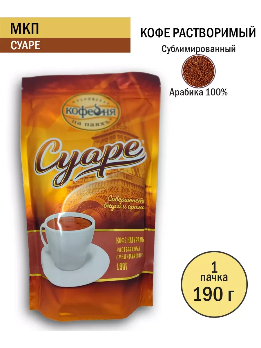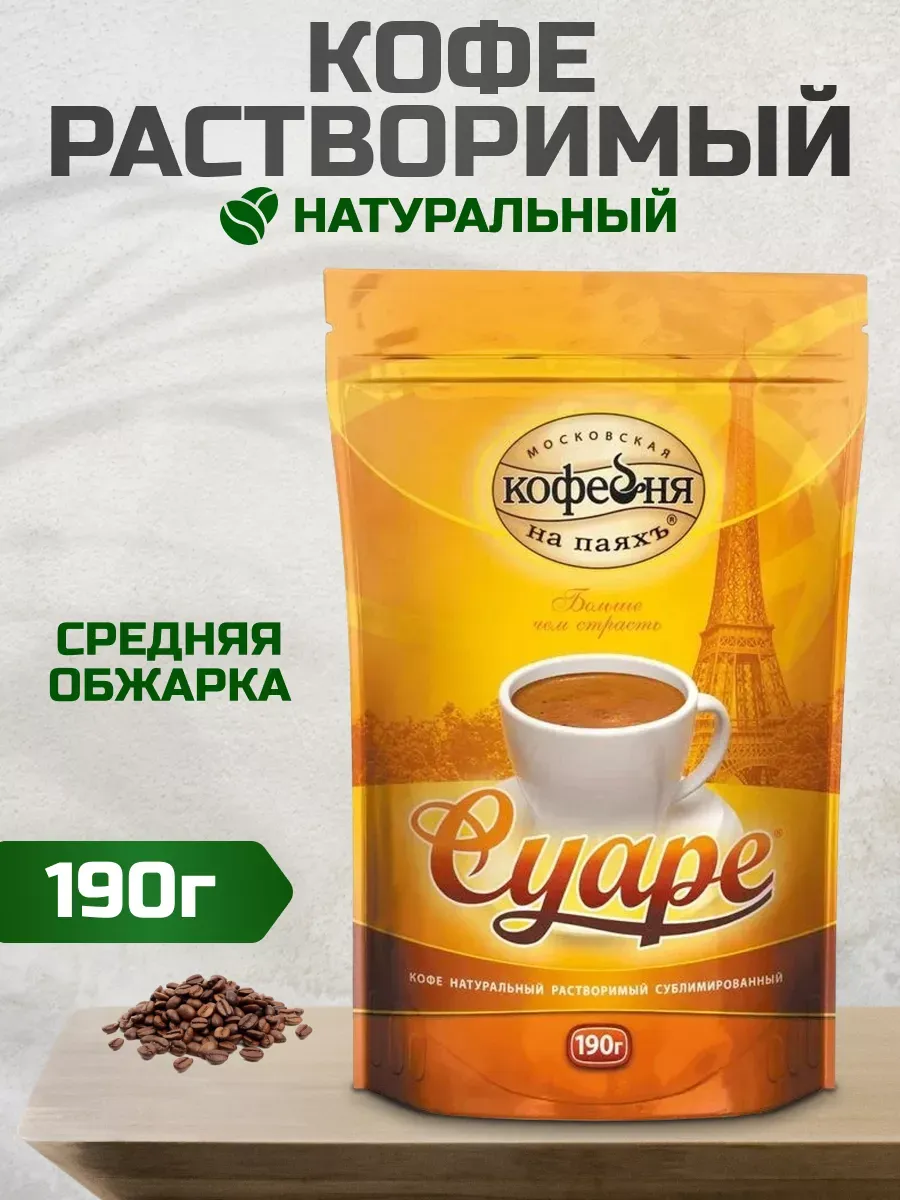 Кофе растворимый сублимированный Московская кофейня на паяхъ Суаре 190 г отличается крепким, насыщенным вкусом с благородной горчинкой и великолепным ароматом. Слово суаре означает званый вечер с легкой шутливой атмосферой. Этот напиток выбирают многие офисные коллективы, дружные студенческие компании, большие и маленькие семьи и т.д. Московская кофейня на паяхъ создает качественный кофе благодаря неизменным составляющим: квалифицированные специалисты с большим опытом работы, современное высокотехнологичное оборудование и любовь к своему делу. На сегодняшний день компания - один из лидеров на российском рынке. Чтобы приготовить кофе, возьмите 1-2 чайные ложки кофейных гранул, залейте их горячей, но не кипящей водой и наслаждайтесь! По желанию можно добавить сахар и сливки, карамель или мороженое. Впрочем, он придется по вкусу и без дополнительных ингредиентов. Упакован кофе в вакуумный пакет золотисто-янтарного цвета, который надежно бережет кофейные гранулы от контакта с воздухом и влагой, сохраняя все свойства и аромат любимого напитка. Состав: 100% натуральный кофе.