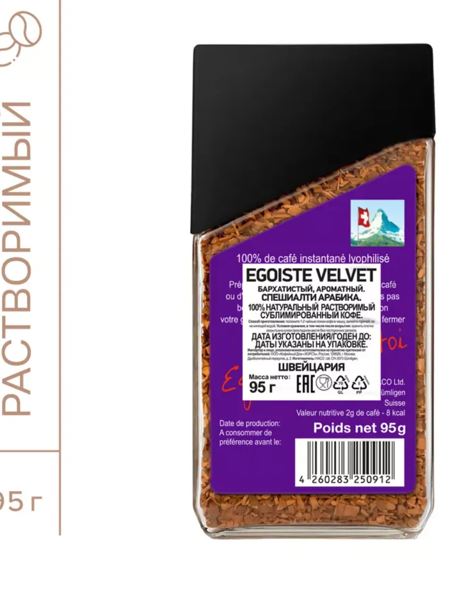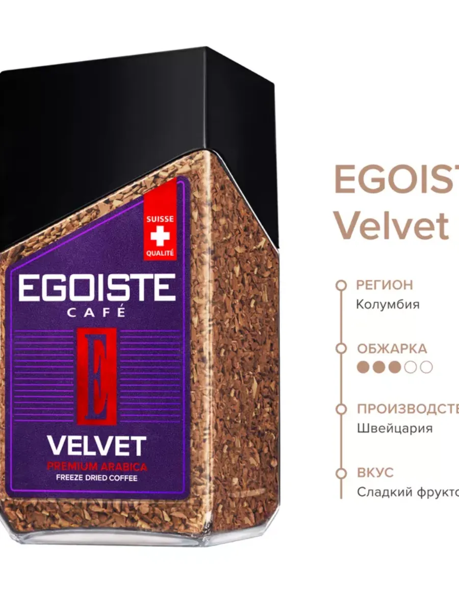 Кофе растворимый Velvet от бренда EGOISTE представляет собой идеальный выбор для любителей ароматного и качественного напитка. Этот кофе изготовлен из выбранных сортов кофейных зерен, что обеспечивает его богатый вкус и неповторимый аромат. Упаковка в 100 грамм позволяет вам легко взять с собой и наслаждаться любимым напитком в любое время и в любом месте. Благодаря простому и быстрому способу приготовления, кофе Velvet от EGOISTE станет незаменимым спутником вашего дня.