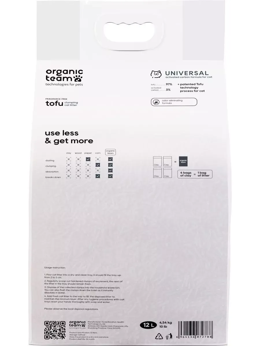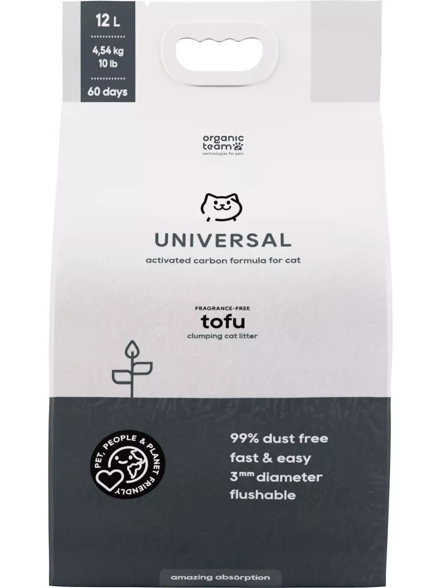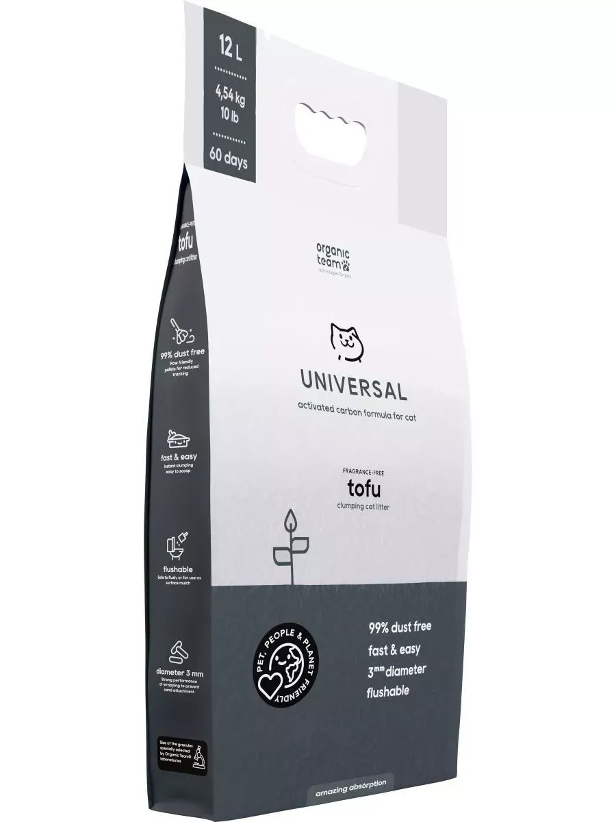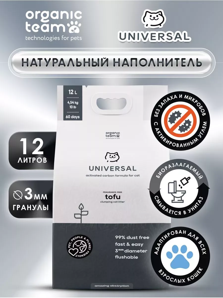 Комкующийся наполнитель тофу для кошачьего туалета Organic Team Universal, с активированным углем для защиты от бактерий и инфекций, смываемый, 12 л. Линейка Organic Team Tofu – это уникальные экологичные наполнители для кошачьего туалета из растительных волокон, созданные по запатентованной технологии и сводящие к минимуму проблему безопасной гигиены питомца и ежедневной уборки лотка. Специальный размер пеллет 1-3 мм позволяет еще быстрее образовывать прочные комки за счет плотного прилегания гранул и не дает жидкости проникать на дно лотка. Тофу Organic Team Universal Activated Carbon впитывает в 4 раза лучше традиционных глиняных наполнителей, более практичен в расходе и удобен в утилизации – сухие комочки без труда удаляются из лотка, не рассыпаются и утилизируются в туалет, так как состоят из полностью биоразлагаемых волокон! Одна упаковка тофу Organic Team заменит 4 упаковки глиняного наполнителя! Специальная формула с активированным углем подавляет развитие болезнетворных организмов, защищая кошку от инфекций, а шлифованная поверхность пеллет создает комфортные условия во время туалета. Благодаря полному отсутствию пыли, наполнитель избавит от аллергии вас и вашего питомца! Способ применения: Засыпьте чистый и сухой лоток пеллетами тофу на уровне не менее 2-5 см. Регулярно удаляйте комочки и экскременты, досыпая на их место свежий наполнитель. Использованный наполнитель можно утилизировать в ведро или смывать в унитаз. При наличии сразу нескольких комков, смывать в унитаз их необходимо поочередно, дополнительно проливая воду после каждого комочка. Полная замена наполнителя 1 раз в месяц при использовании по инструкции.По результатам независимого проведенного интернет-опроса среди потребителей товаров, по мнению участников опроса, наполнители бренда Organic Team Tofu аналогичны (по ключевым параметрам и требованиям) Cat Step Tofu (Кэт Степ Тофу), ECO-Premium (Эко Премиум).
