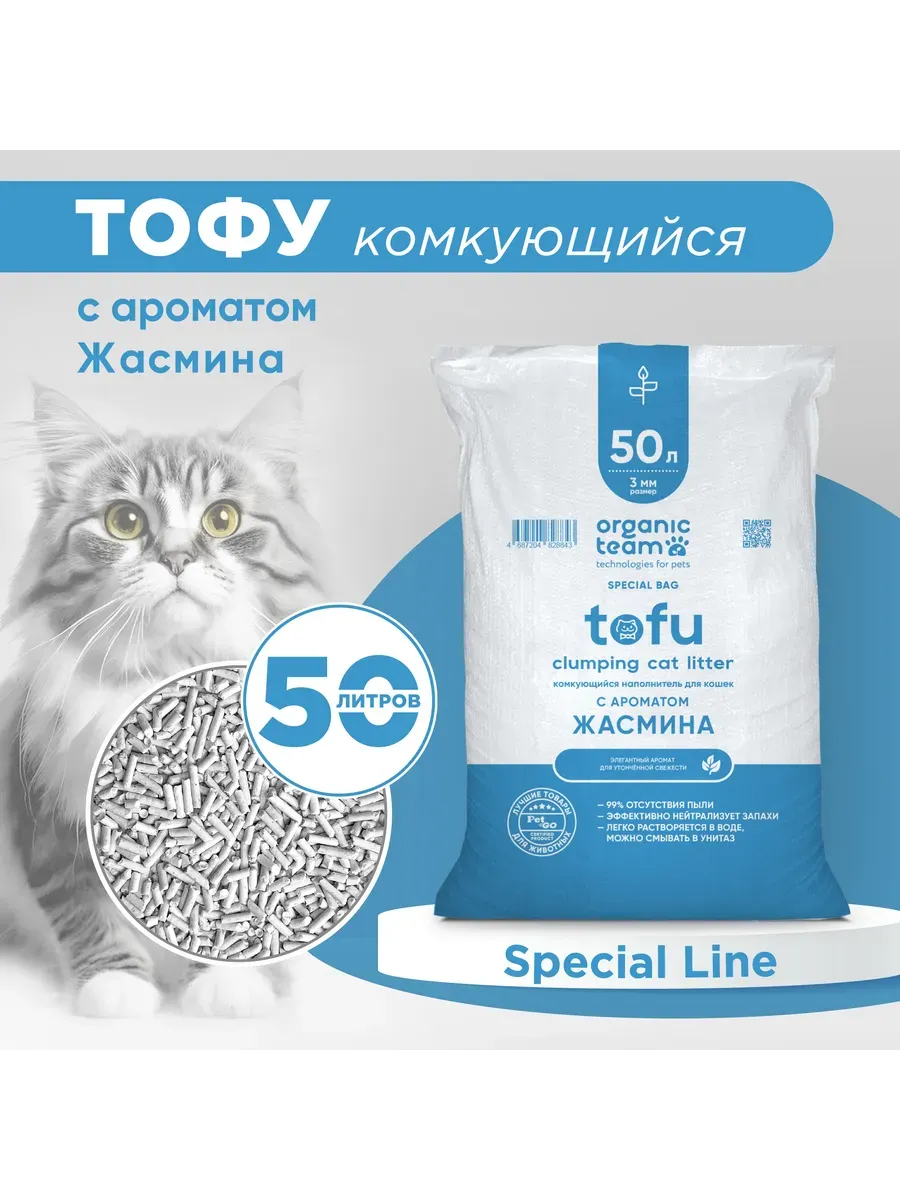 Наполнитель Organic Team для кошачьего туалета на основе соевого тофу — это экологически чистый и безопасный выбор для заботливых хозяев. Этот комкующийся наполнитель эффективно впитывает влагу и неприятные запахи, оставляя лоток свежим и чистым. Соевый тофу — натуральный и биоразлагаемый материал, который не раздражает чувствительную кожу кошек. Его мягкая текстура приятна для лапок питомца, а комкующаяся формула позволяет легко удалять отходы. Наполнитель Organic Team — это забота о вашем коте и об окружающей среде. Хотите узнать больше о его преимуществах? Наполнитель Organic Team не содержит пыли, что делает его идеальным выбором для аллергиков. Состав наполнителя включает органическую сою (сухое волокно), пищевой крахмал, воду и пробиотики. Эта уникальная формула делает его не только эффективным, но и полезным для здоровья вашего питомца. Он подходит для нескольких кошек и не прилипает к лапкам, сохраняя чистоту в доме. А знаете, что еще удобно? Его можно смывать в туалет!